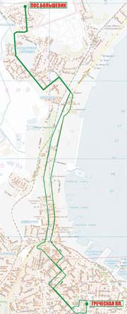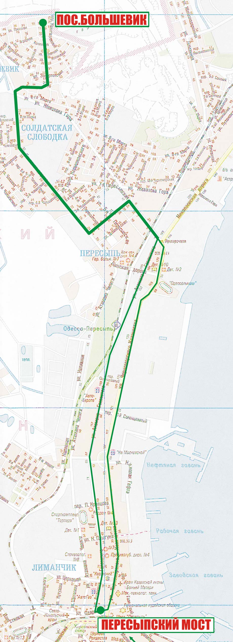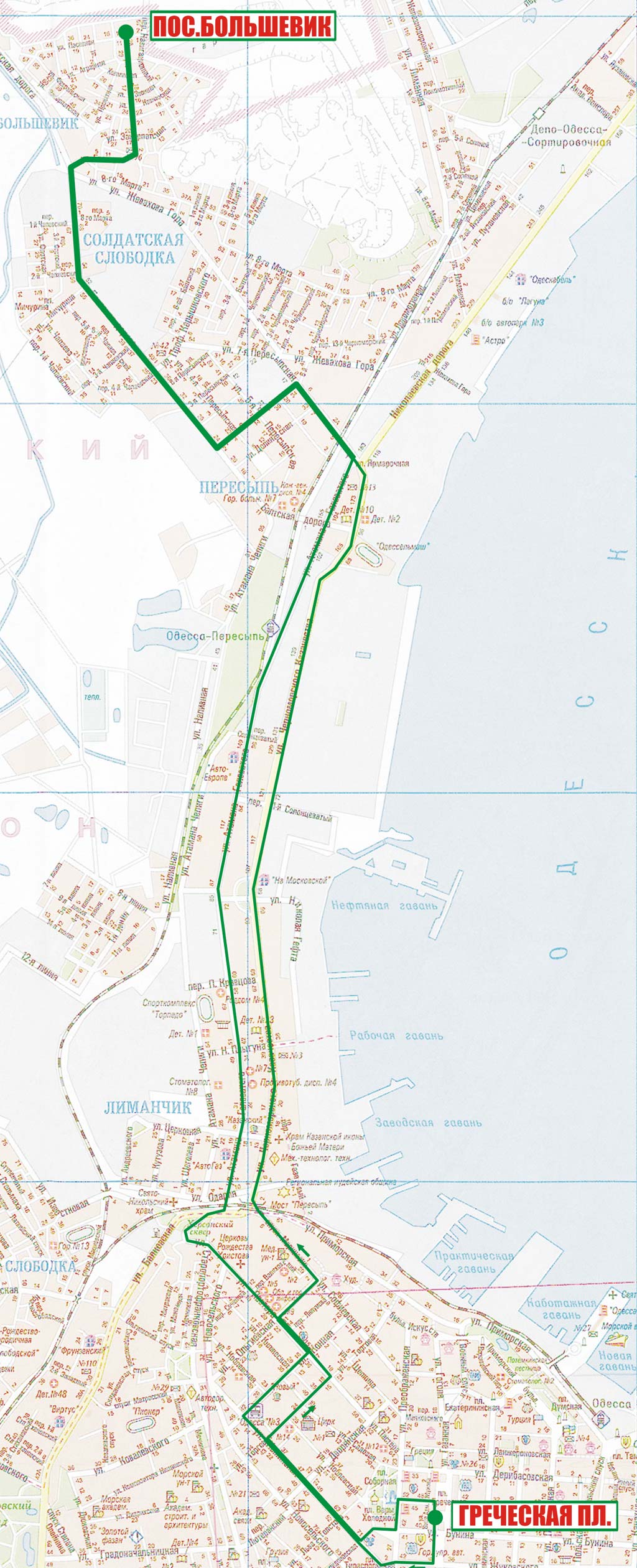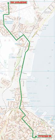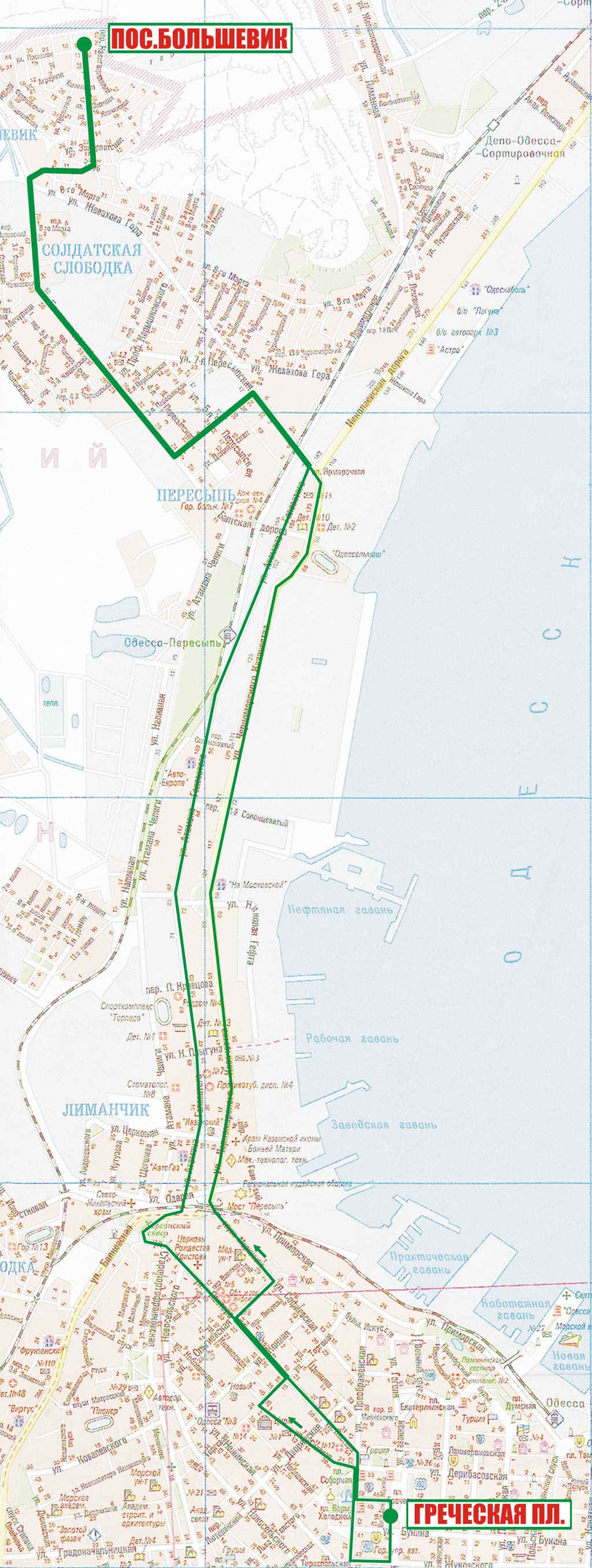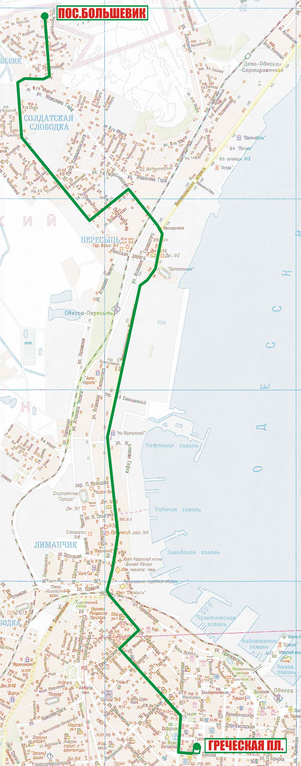 Пос. "Большевик" - Главная - Балтская дорога - 3-я Пересыпская - 7-я Пересыпская - Бажакина - Херсонский сп. - Пастера - Преображенская - Греческая - Греческая пл. |