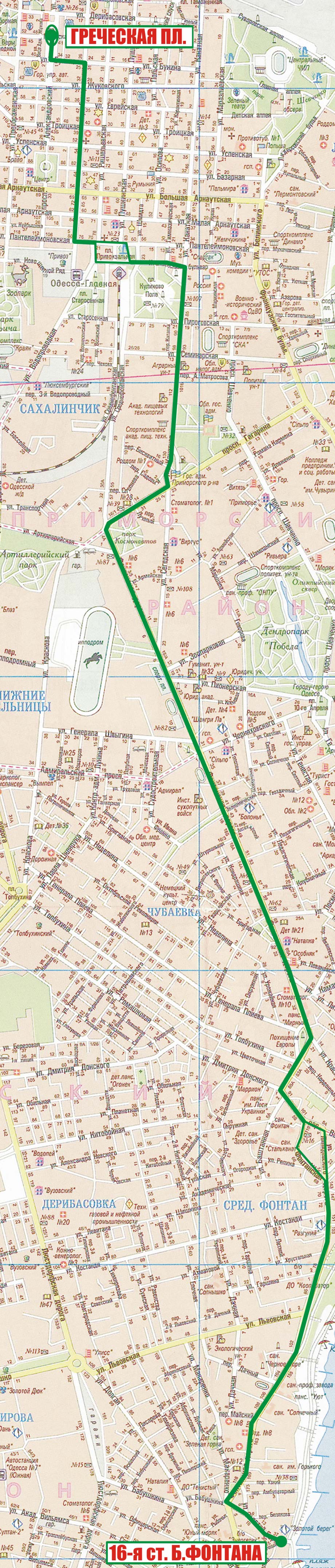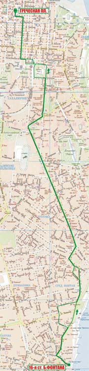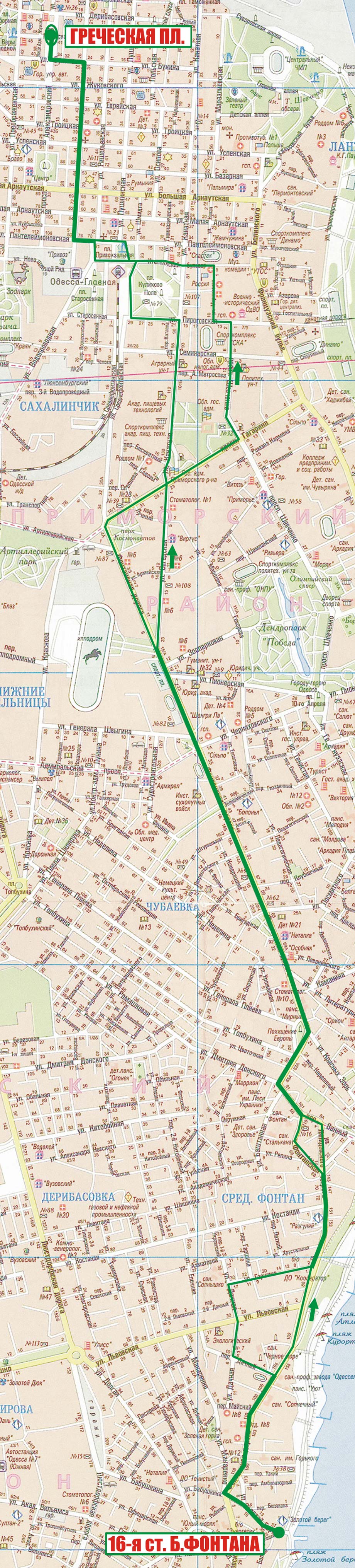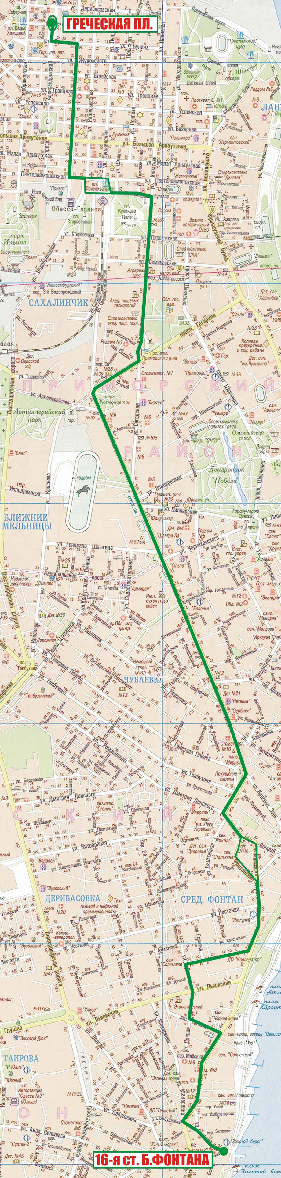 Греческая пл. - Бунина - Екатерининская - Пантелеймоновская - Ришельевская - Итальянский б-р - ж.д. вокзал - Куликово поле - Канатная - Ботаническая - Фонтанская дорога - ул. Золотой Берег - 16-я ст. Б. Фонтана (пляж "Золотой Берег") |