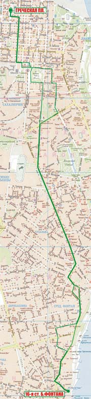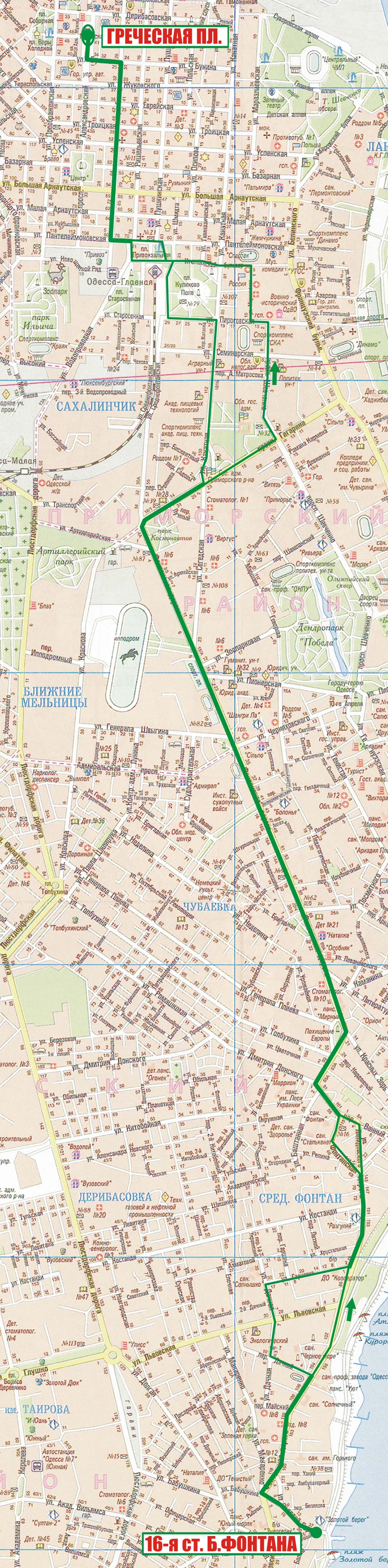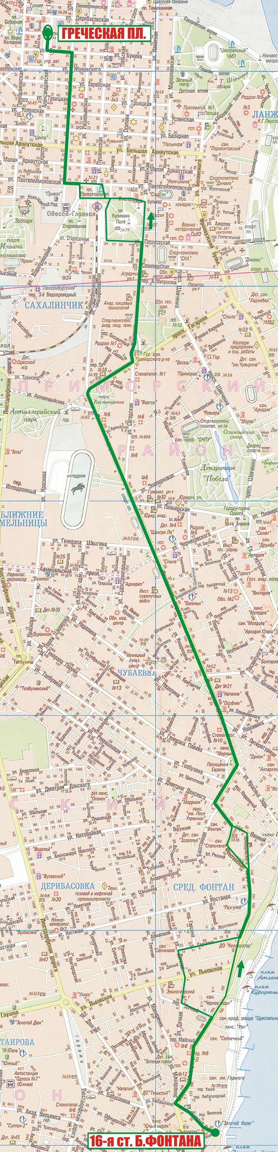 Греческая пл. - Бунина - Екатерининская - Пантелеймоновская - Ришельевская - Итальянский б-р - ж.д. вокзал - Куликово поле - Канатная - Ботаническая - Фонтанская дорога - ул. Золотой Берег - 16-я ст. Б. Фонтана (пляж "Золотой Берег") |