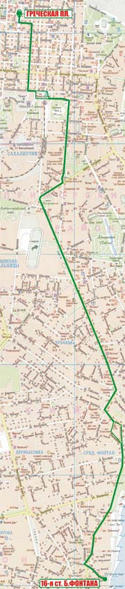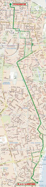 Греческая пл. - Бунина - Екатерининская - Пантелеймоновская - Ришельевская - Итальянский б-р (обратно Пантелеймоновская) - ж.д. вокзал - 3-й Куликовский пер. - Пироговская - Канатная (обратно Итальянский б-р) - просп. Гагарина - Фонтанская дорога (до 12-й станции) - Гаршина - Дачная - Дачный пер. - Фонтанская дорога (от 14-й станции) - ул. Золотой Берег - 16-я ст. Б. Фонтана (пляж "Золотой Берег") |