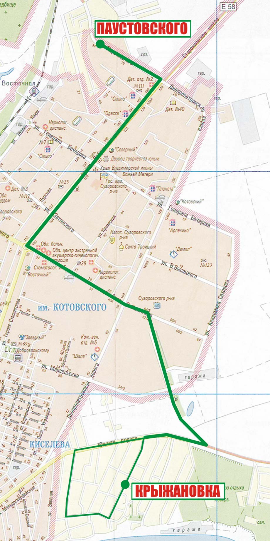 Паустовского - Днепропетровская дорога - Николаевская (Крыжановка) - Первомайская (Крыжановка) - Ленина (Крыжановка) - Котовского (Крыжановка) - Крыжановка |