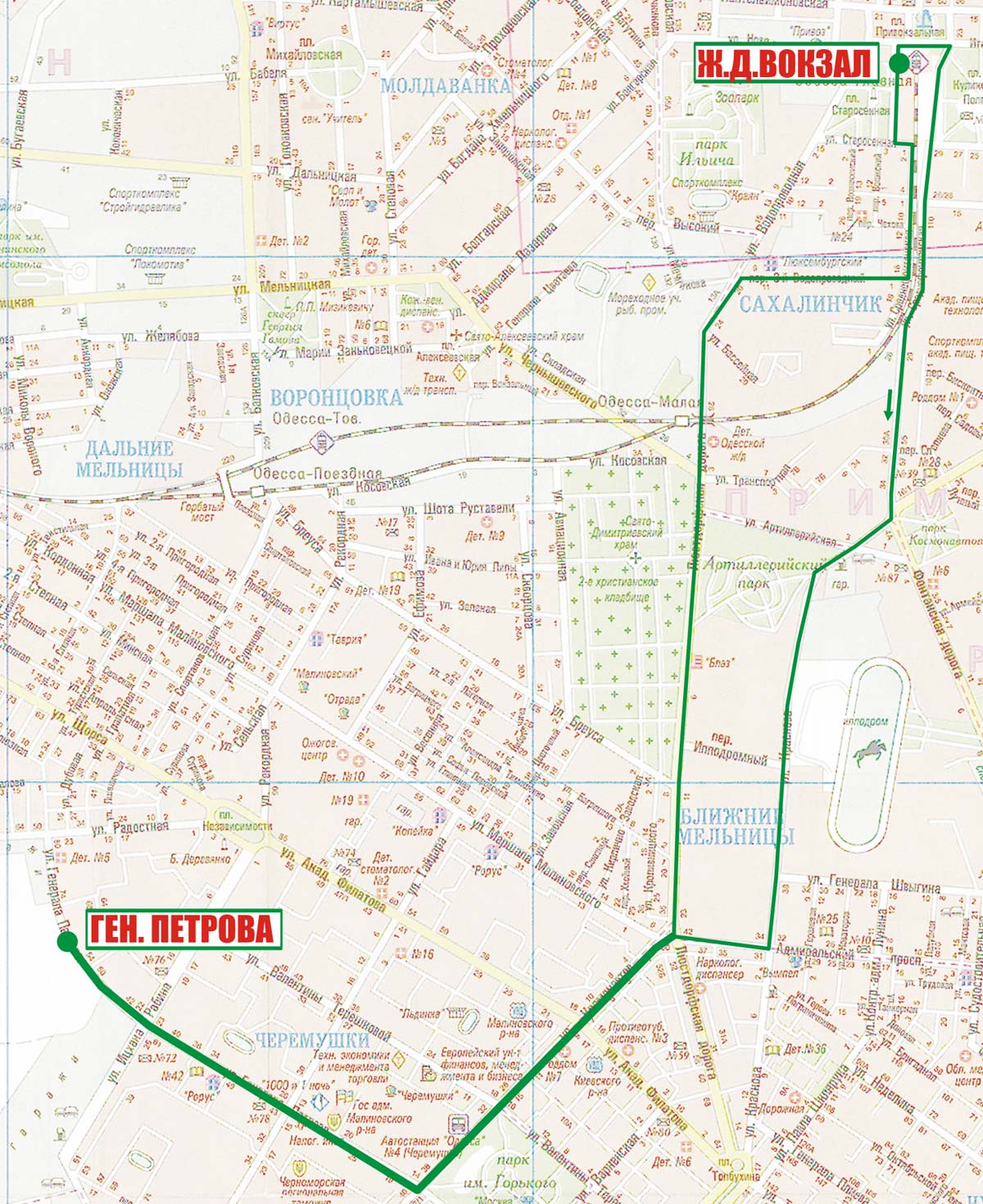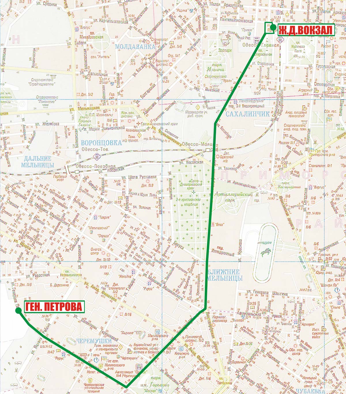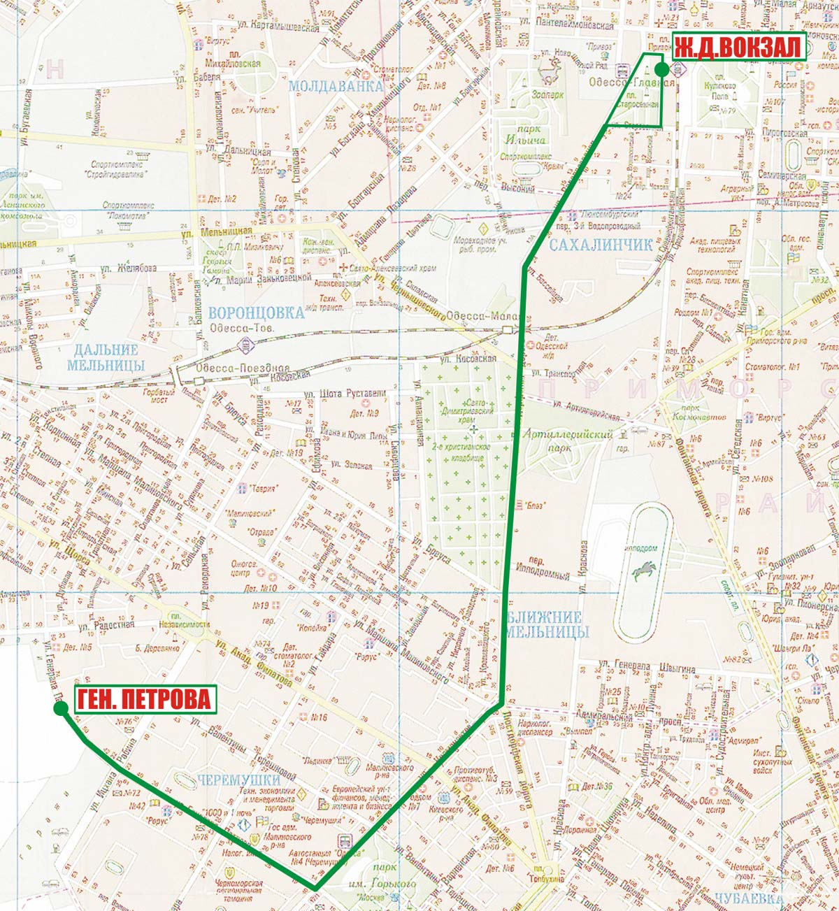 Ж.д. вокзал - Судебный пер. - Пантелеймоновская - Ришельевская (обратно Итальянский б-р) - Водопроводная - Люстдорфская дорога - Космонавтов - Генерала Петрова |