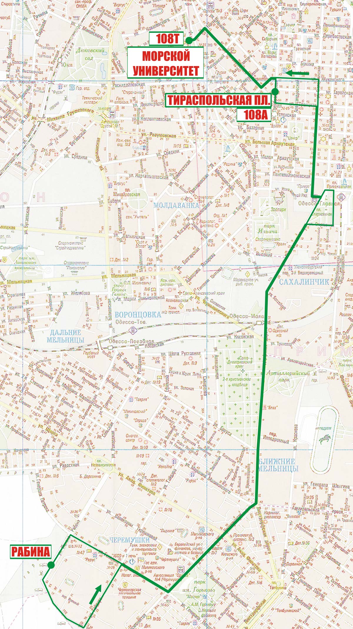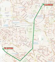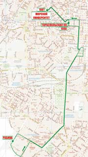 Морской Университет - Торговая - Новосельского - Тираспольская - Тираспольская пл. - Преображенская - Троицкая (обратно Жуковского) - Екатерининская - Старосенная пл. - Водопроводная - Люстдорфская дорога - Космонавтов - Генерала Петрова (обратно 25-й Чапаевской дивизии - Гайдара) - Рабина |