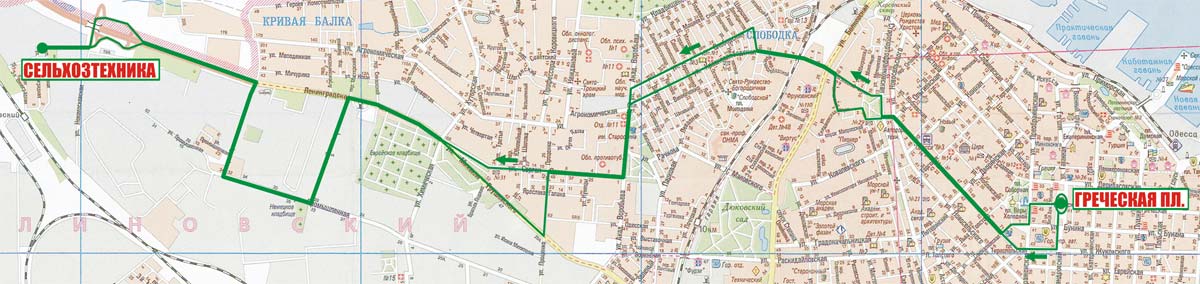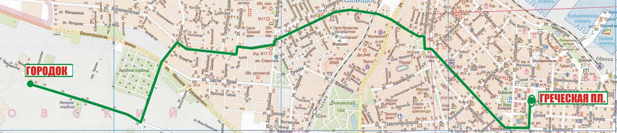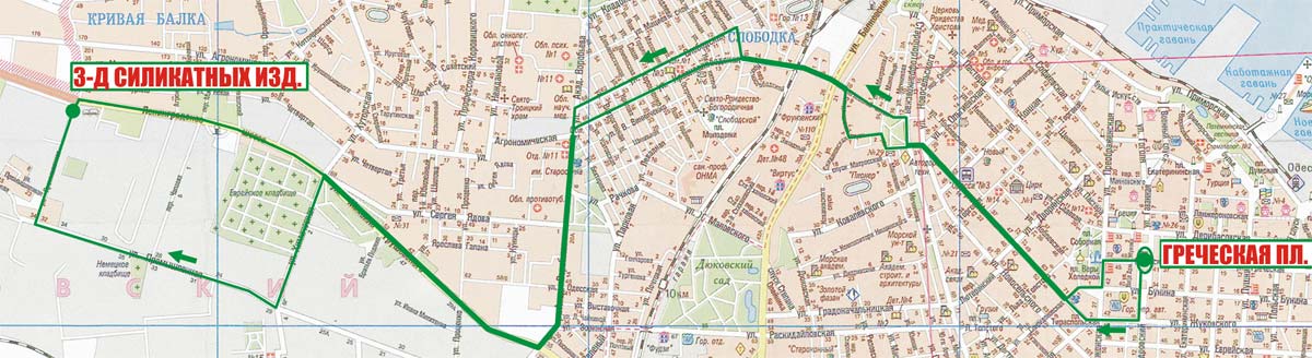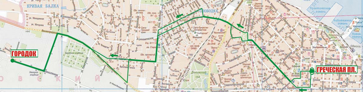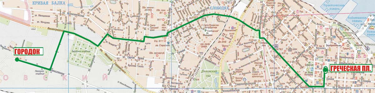 Греческая пл. - Александровский просп. - Жуковского - Тираспольская пл. - Нежинская - Ольгиевская - Старопортофранковская - Ольгиевский сп. - Городская - Кривая Балка - Химическая - Промышленная - Городок |