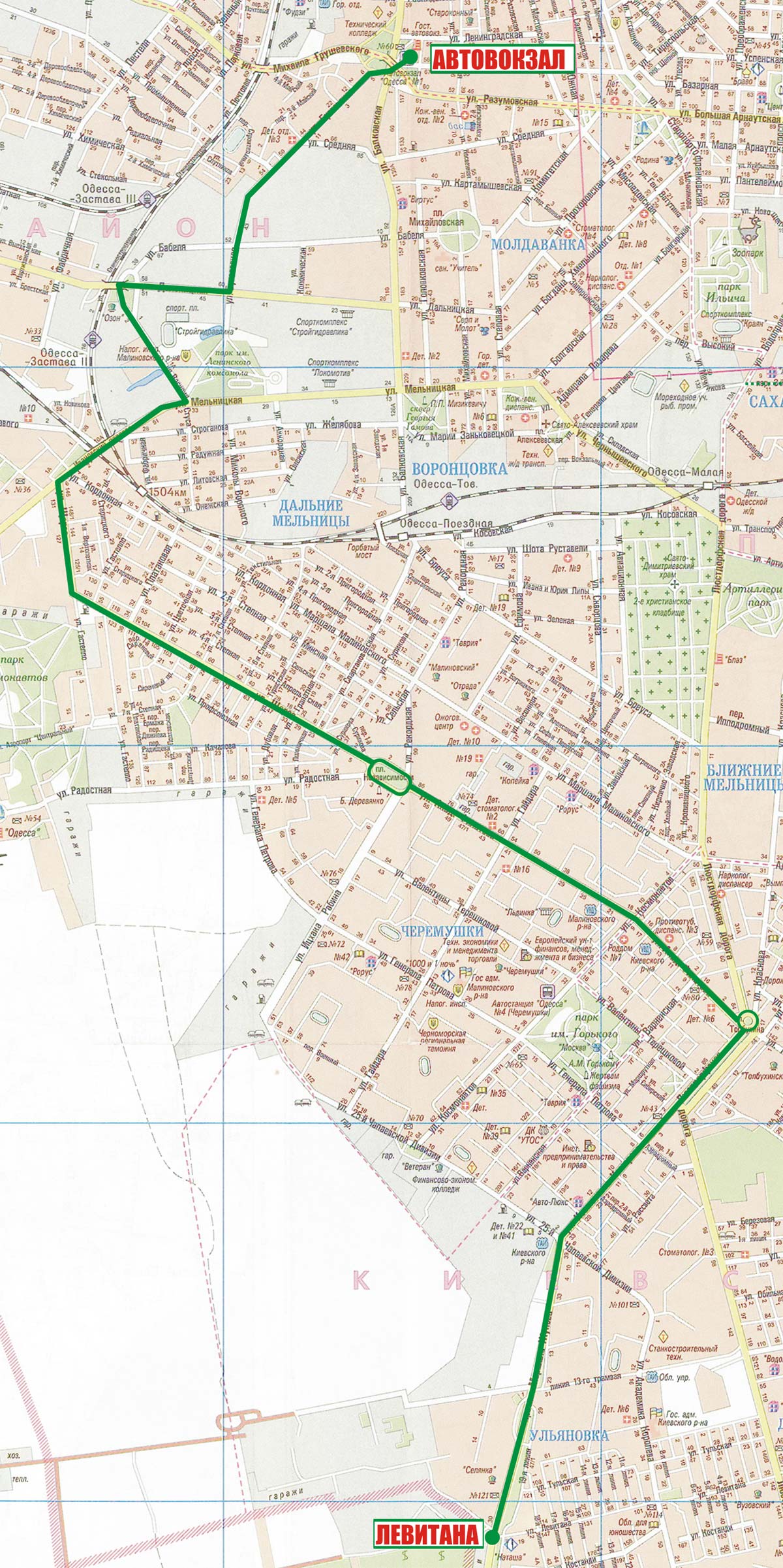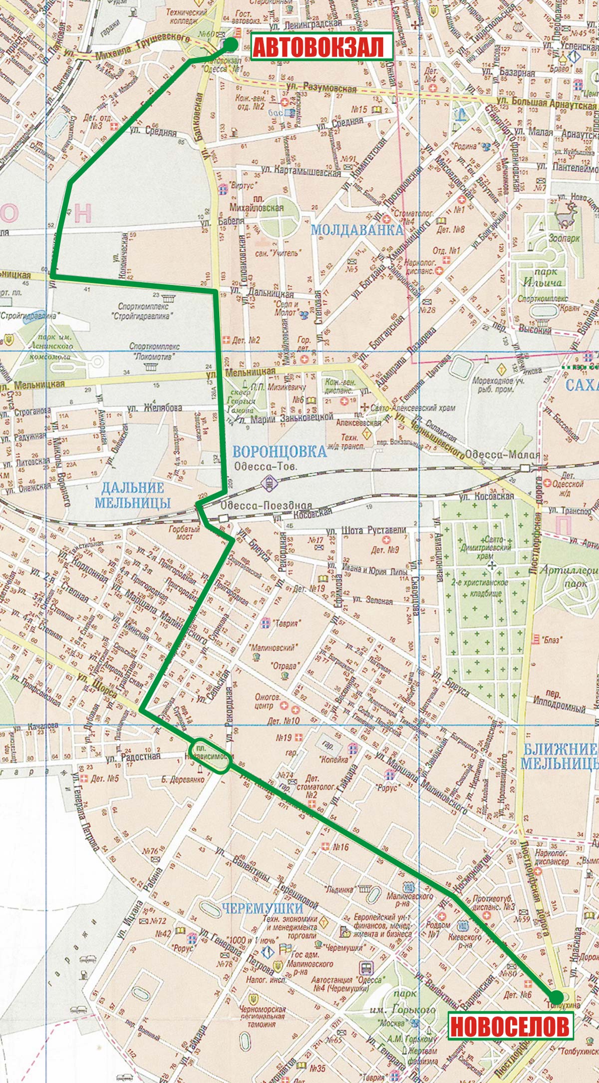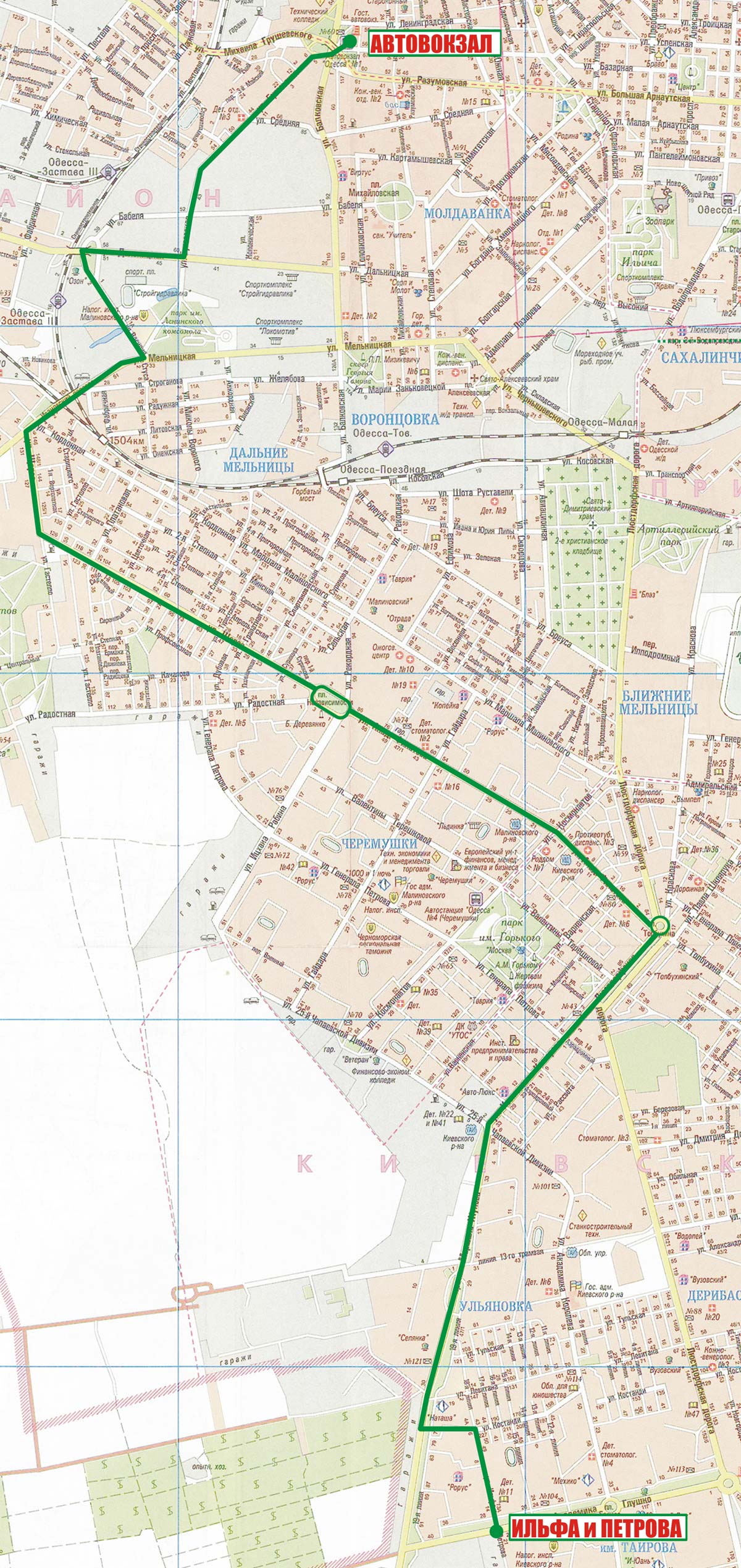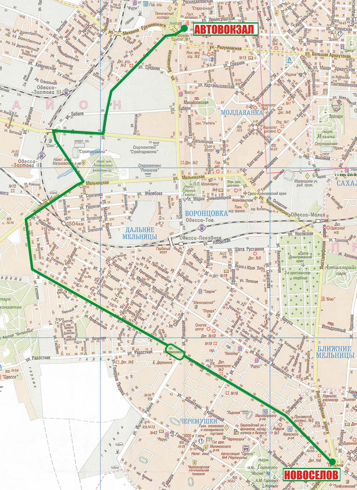 Автовокзал - Бугаевская - Дальницкая - Балковская - Горбатый мост - Спартаковская - 5-я Степная - Ак. Филатова - Пл. Толбухина |