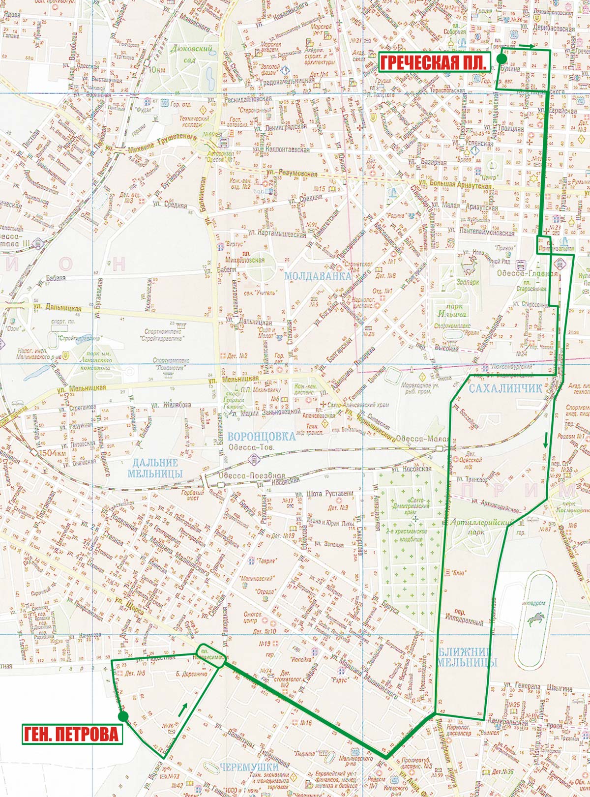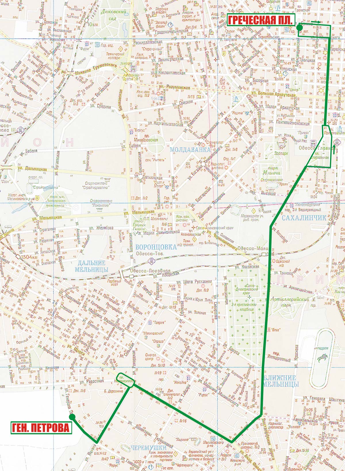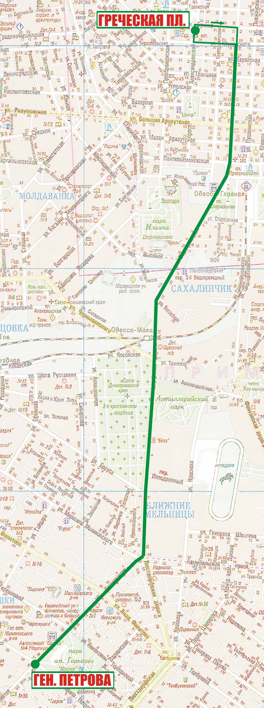 Греческая пл. - Греческая (обратно Жуковского - Александровский просп.) - Ришельевская - Итальянский б-р - Привокзальная пл. - Среднефонтанская - Краснова - Адмиральский просп. (обратно Люстдорфская дорога - Водопроводная - 3-й Водопроводный пер. - Среднефонтанская - Старосенная пл.) - Космонавтов - Ак. Филатова - Радостная (обратно Рабина) - Генерала Петрова |