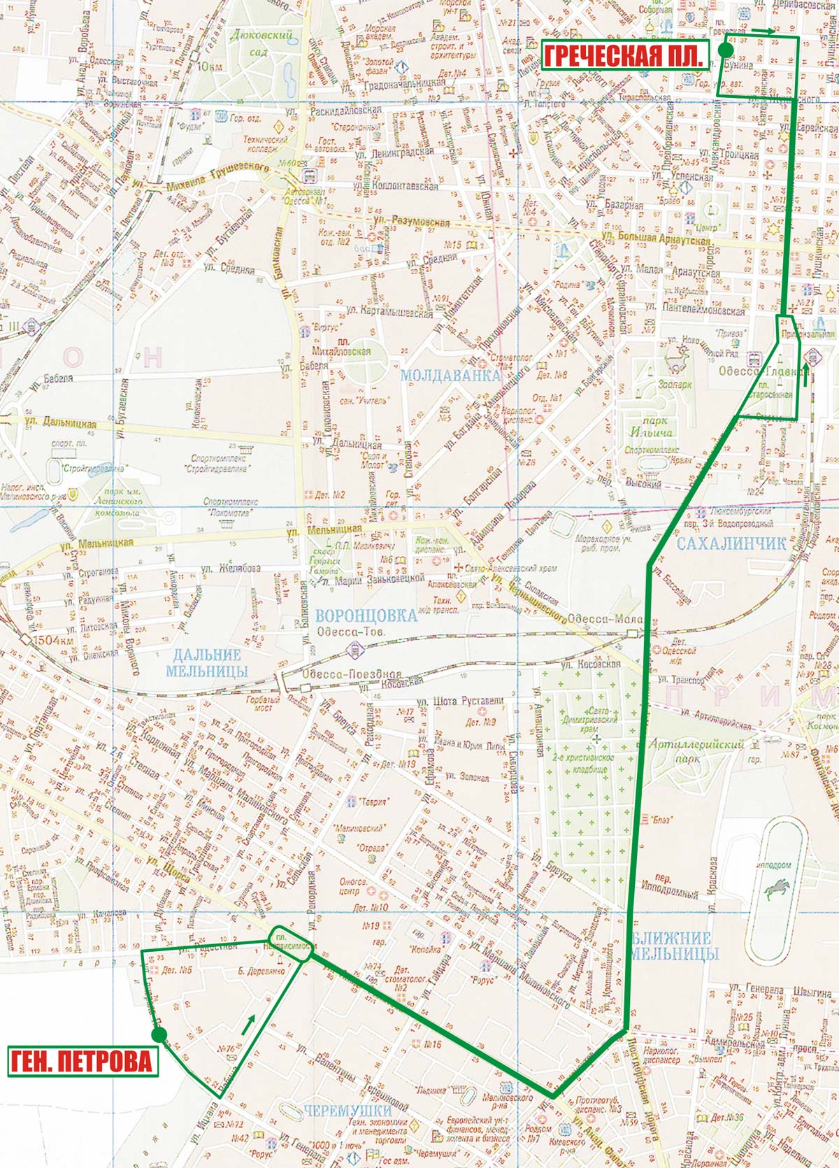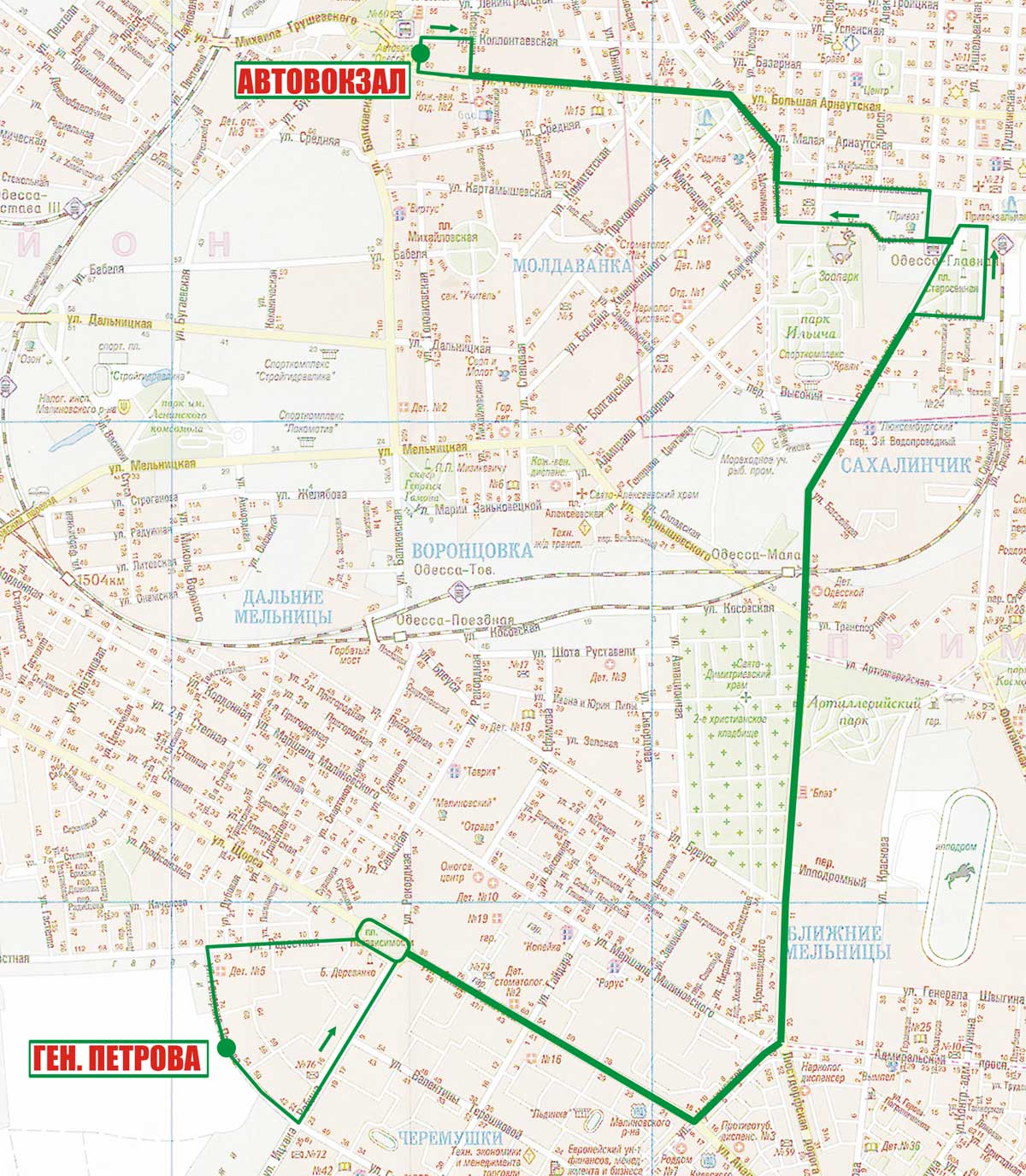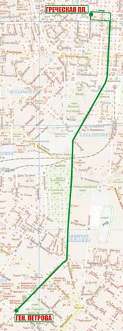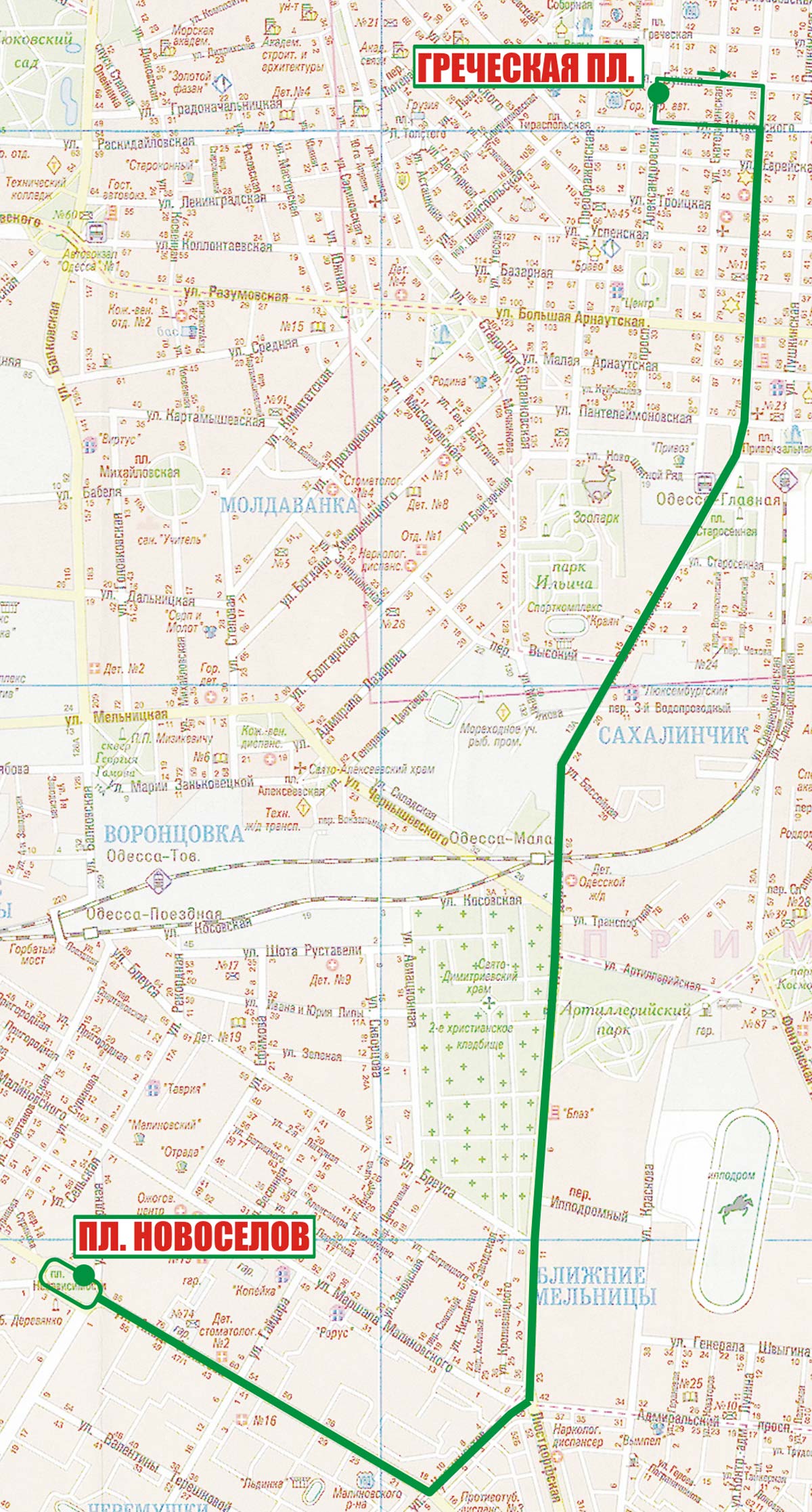 Греческая пл. - Бунина (обратно Жуковского - Александровский просп.) - Ришельевская - Старосенная пл. - Водопроводная - Люстдорфская дорога - Космонавтов - Ак. Филатова - Дом Мебели |