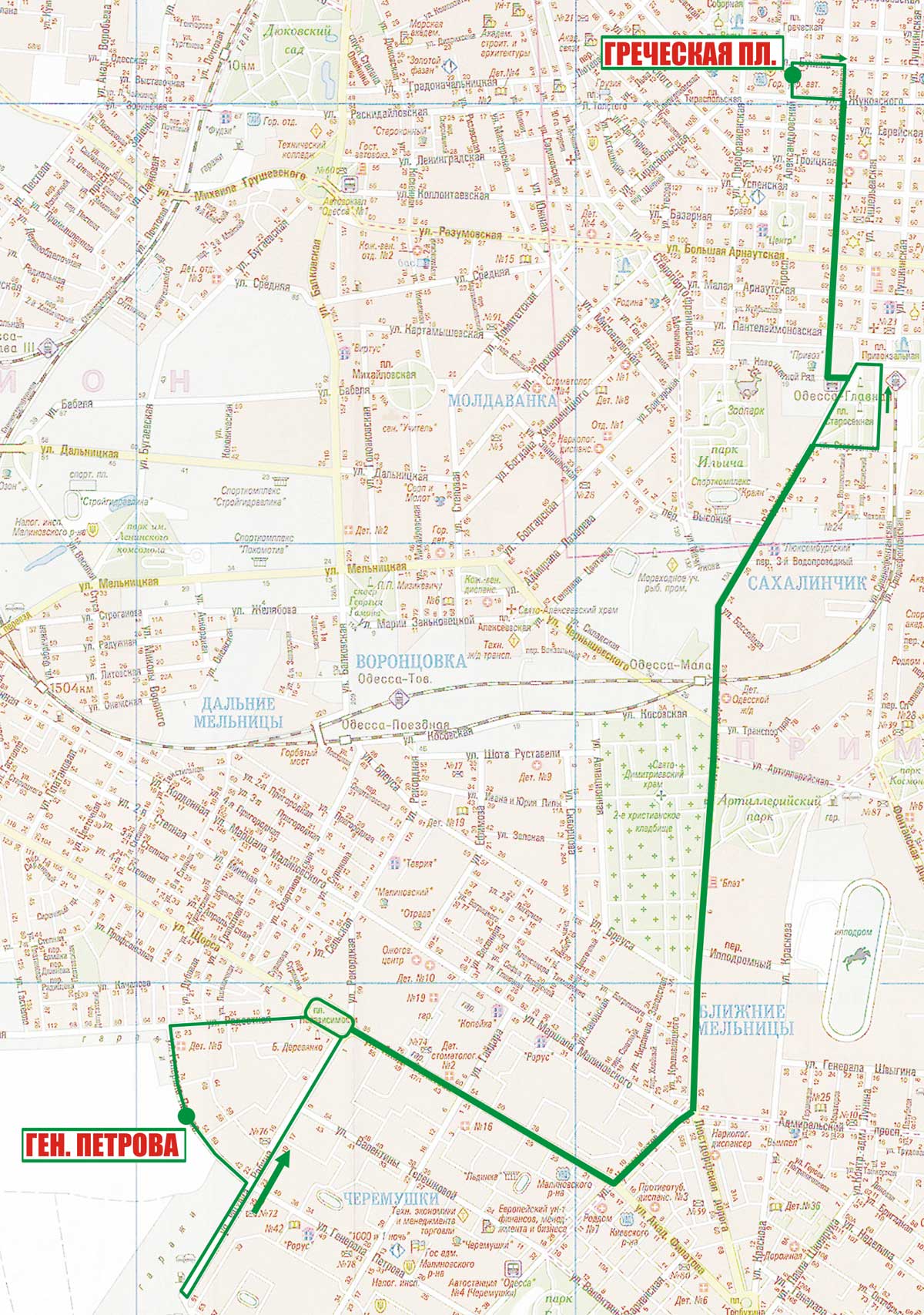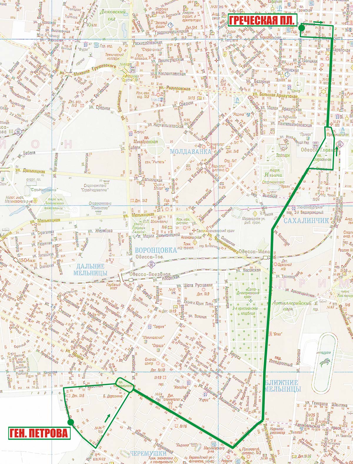 Греческая пл. - Греческая (обратно Жуковского - Александровский просп.) - Ришельевская - Старосенная пл. - Водопроводная - Люстдорфская дорога - Космонавтов - Ак. Филатова - Радостная (обратно Рабина) - Генерала Петрова |