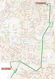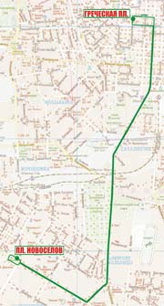 Греческая пл. - Александровский просп. - Троицкая (обратно Жуковского) - Екатерининская - Старосенная пл. - Водопроводная - Люстдорфская дорога - Космонавтов - Ак. Филатова - Рабина - Генерала Петрова |