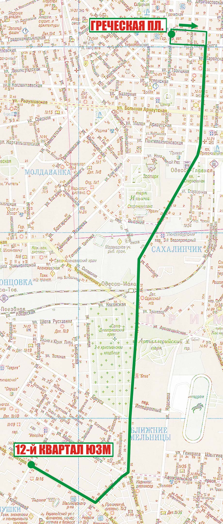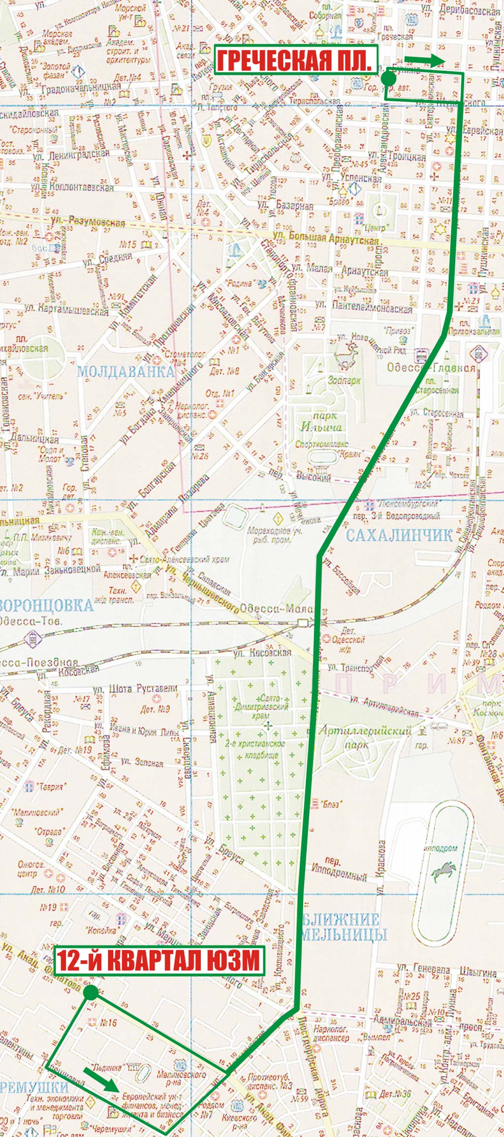 Греческая пл. - Бунина - Ришельевская - Старосенная пл. - Водопроводная - Люстдорфская дорога - Космонавтов - 7/10-й квартал ЮЗМ |