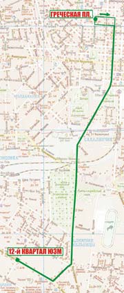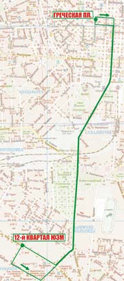 Греческая пл. - Бунина - Ришельевская - Старосенная пл. - Водопроводная - Люстдорфская дорога - Космонавтов - Новоселов (обратно Терешковой) - Гайдара - 0/12-й квартал ЮЗМ |
