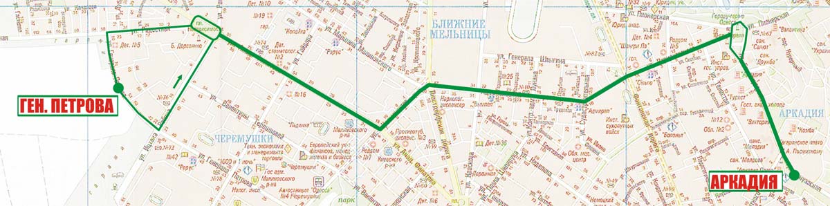 Генерала Петрова - Рабина (обратно - Радостная) - Ак. Филатова - Космонавтов - Адмиральский просп. - Черняховского - Новоаркадийская - Аркадия |