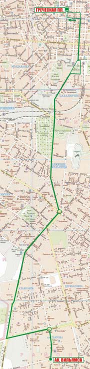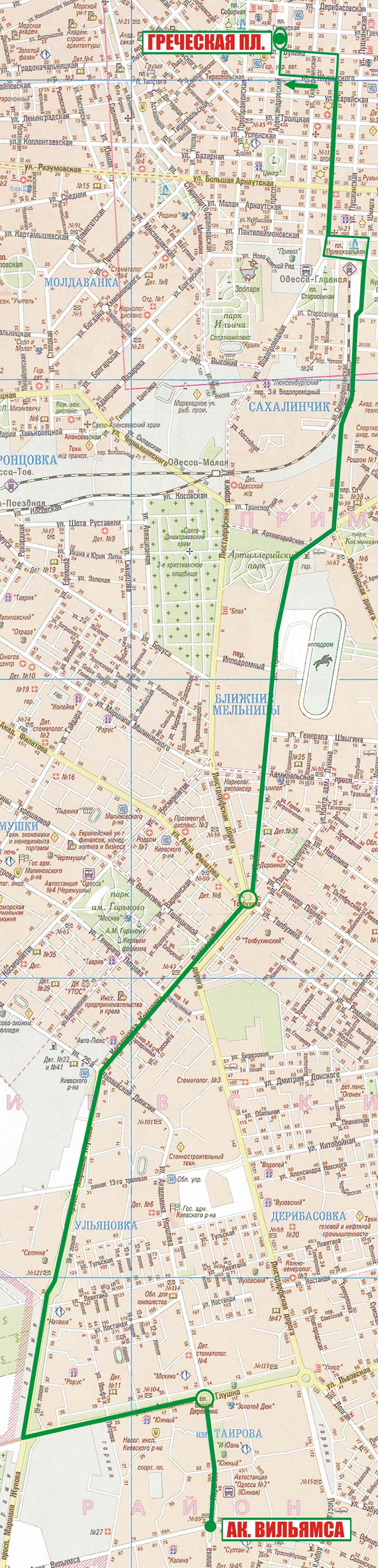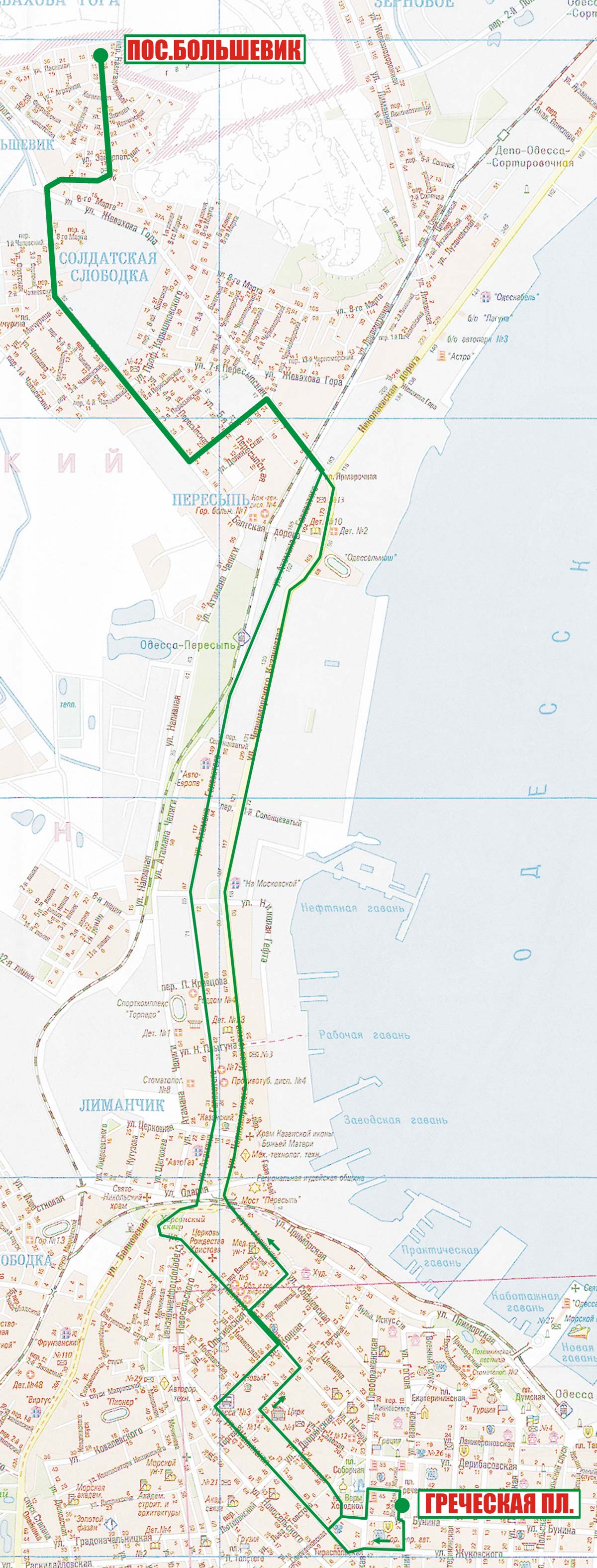 Пос. "Большевик" - Главная - Балтская дорога - 3-я Пересыпская - 7-я Пересыпская - Бажакина - Херсонский сп. - Пастера - Конная - Нежинская - Спиридоновская - Бунина - Преображенская - Греческая - Греческая пл. |