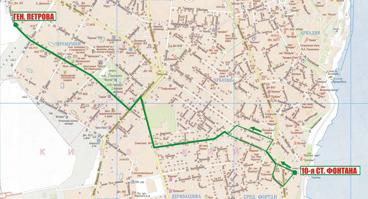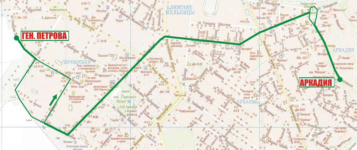 Генерала Петрова - Рабина - 25-й Чапаевской дивизии (обратно Гайдара - Генерала Петрова) - Космонавтов - Адмиральский просп. - Черняховского - Новоаркадийская - Аркадия