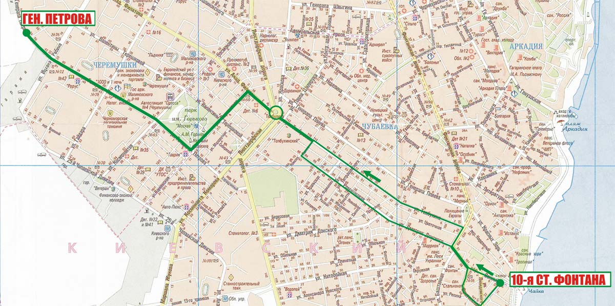 Генерала Петрова - Варненская - Ак. Филатова - Толбухина - Ромашковая (обратно Толбухина) - Дмитрия Донского - Фонтанская дорога - Ванный пер. - 10-я ст. Фонтана