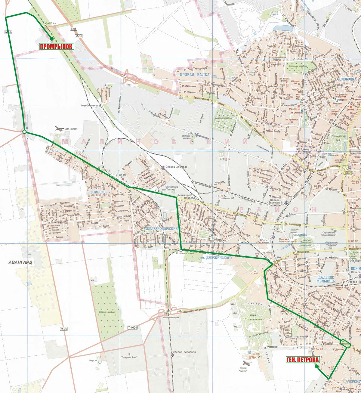 Промрынок "Западный" - Окружная дорога - Тираспольское шоссе - Дальницкое шоссе - Проселочная - Житомирская - Овидиопольская дорога - Щорса - Рабина - Генерала Петрова