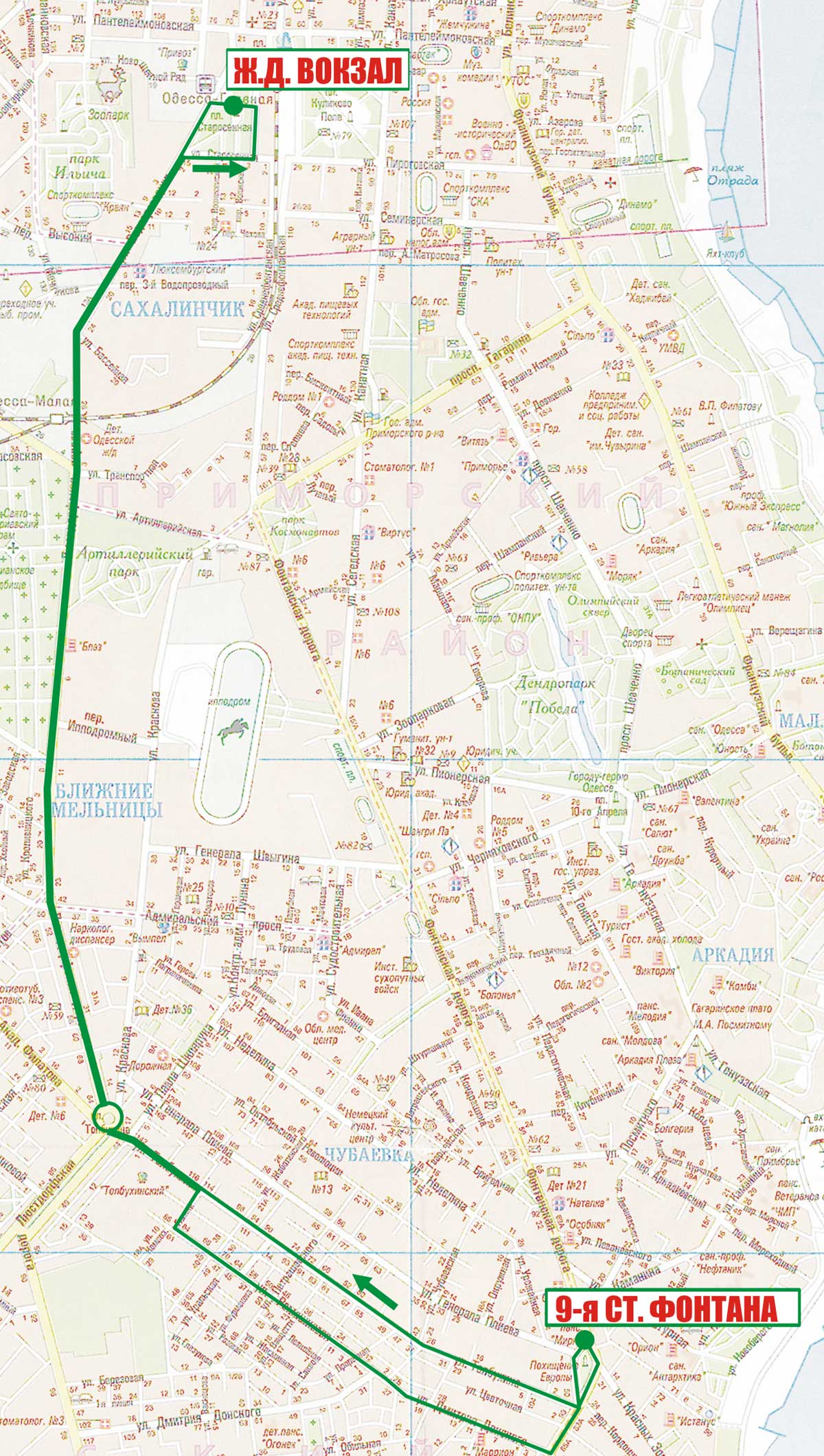 - Фонтанская дорога - Толбухина (обратно Глинки - Ромашковая - Дмитрия Донского) - Люстдорфская дорога - Водопроводная - Старосенная пл. -