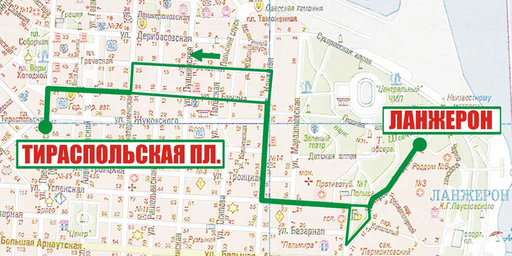 Ланжерон - Лидерсовский б-р (обратно Белинского) - Успенская - Канатная - Греческая - Преображенская - Тираспольская пл. |