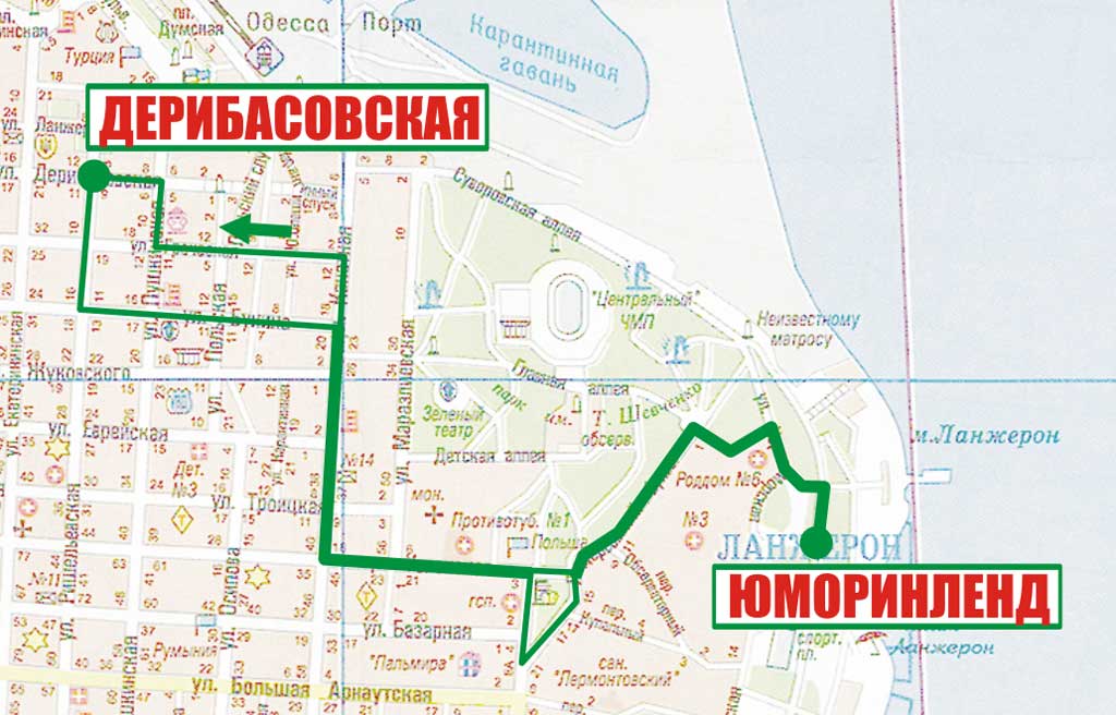 Юморинленд - Лидерсовский б-р (обратно Белинского) - Успенская - Канатная - Греческая - Пушкинская (обратно Ришельевская - Бунина) - Дерибасовская (Музей восковых фигур) |
