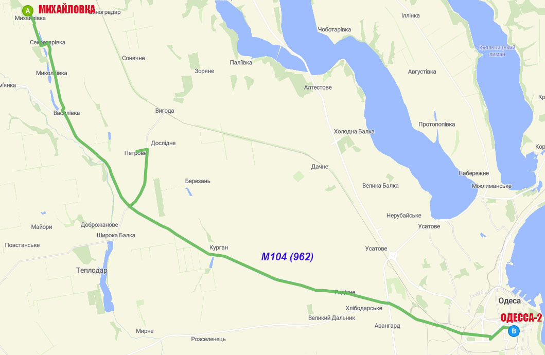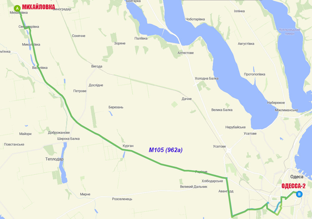 | M105 | Одесса-2 (111645) - Заньковецкой (ст. Товарная) (55866) - Селекционный институт (8639) - Промрынок 7-й км. (111431) - Авангард (111008) - Два столба (111782) - Радостное (112393) - Дальник-1 (112386) - Курган (111839) - Петровское (112469) - Васильевка (112470) - Николаевка (112473) - Секретаровка (112474) - Михайловка (112476) | |