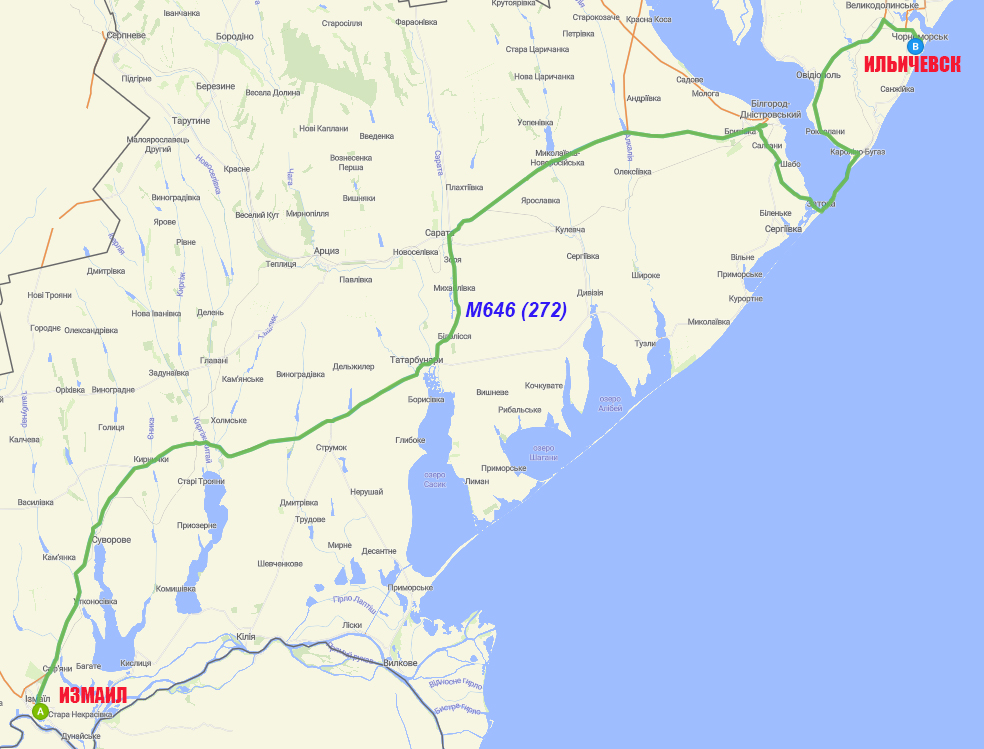 Ильичевск (111271) - Горсовет (111480) - Барабой (112343) - Овидиополь (кольцо) (111752) - Овидиополь (111750) - Роксоланы (111740) - Каролино-Бугаз (111734) - Платформа Морская (111694) - Платформа Дружба (111700) - Станция Солнечная (111704) - Затока (111712) - Станция Бугаз (111713) - Прибрежное (111716) - Салганы (111724)- Белгород-Днестровский (111733) - Роскошное (112506) - Монаши (111865) - Николаевка-Новороссийская (111866) - Заря (111896) - Михайловка (111898) - Белолесье (111903) - Татарбунары (111907) - Баштановка (111908) - Спасское (111910) - Кирнички (111918) - Сафьяны (112240) - Измаил (112498) | |