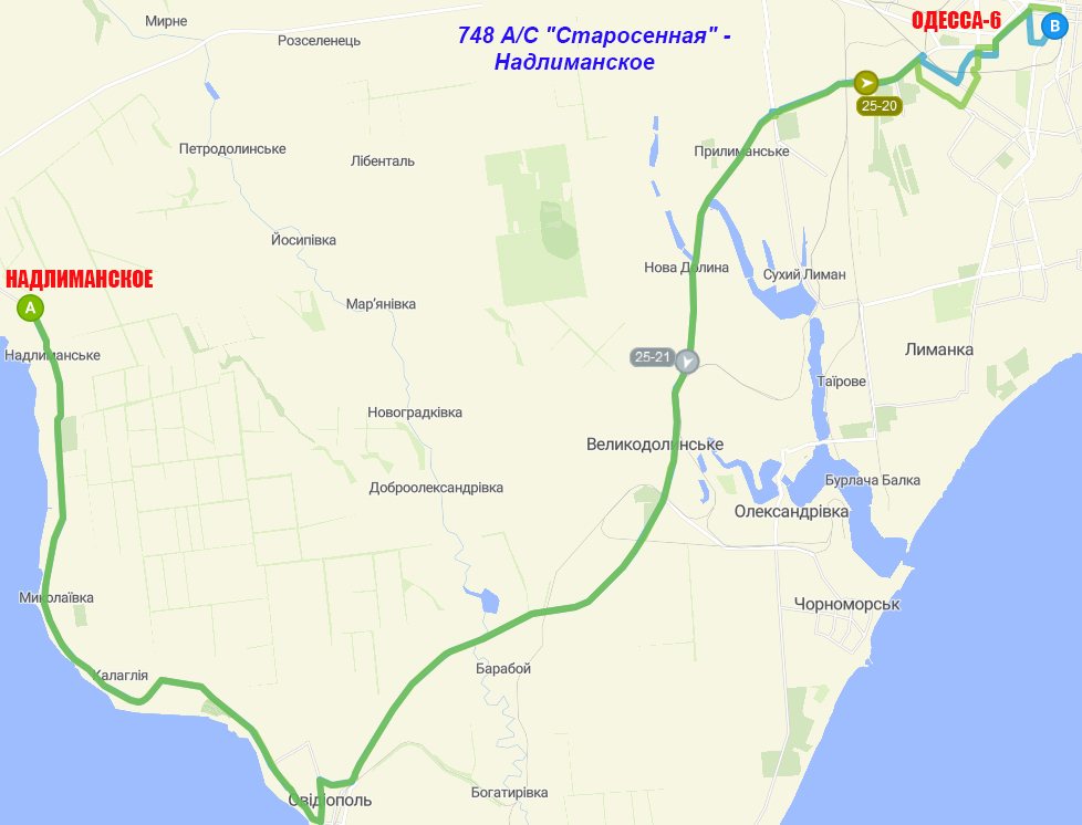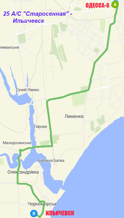 | 25 | Одесса-6 (111646) - Ж.д. вокзал (5564) - Среднефонтанская пл. (26173) - Пл. Толбухина (5546) - ТРЦ "Сити Центр" (7872) - Ж/м "Радужный" (7863) - Таировское кладбище (42736) - Пос. Мизикевича (111298) - Бурлачья Балка (111289) - Малодолинское (111293) - Александровка (111294) - Победы (111274) - Горсовет (111479) - Просп. Мира (111481) - А/С "Ильичевск" (111271) | |