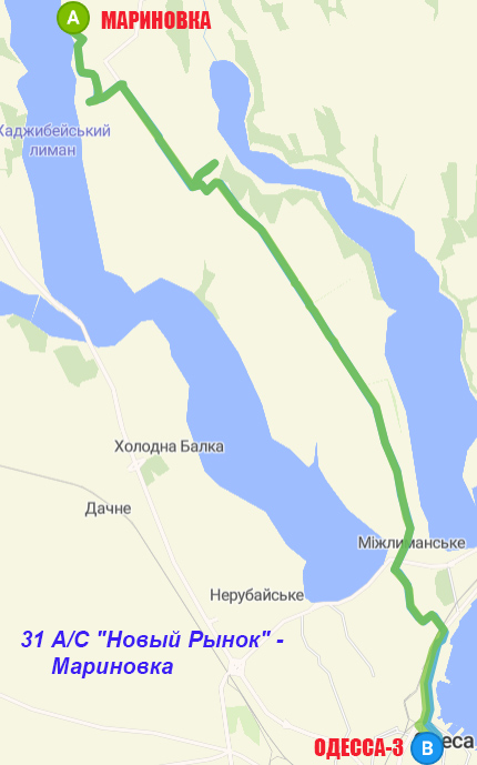 | 31 | Одесса-3 (112426) - Пересыпский мост (11489) - Ярмарочная пл. (14502) - З-д "Большевик" (18333) - Пос. "Жеваховский" (18335) - Межлиманское (Латовка) (112424) - Ильинка (112028) - Новая Ковалевка (112031) - Ковалевка (112438) - Новая Эметовка (112439) - Мариновка (112440) | |