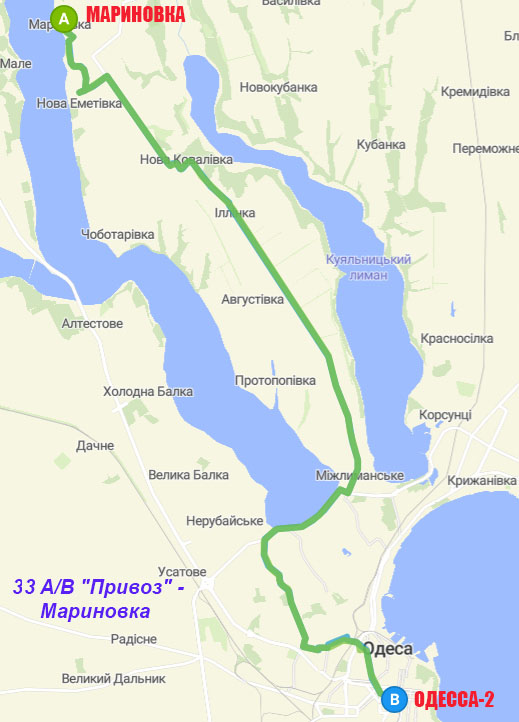 | 33 | Одесса-2 (111270) - Тираспольская (80) - Слободской рынок (17031) - Хуторская (30056) - Цементный з-д (30060) - Усатово (11708) - Котовка (11712) - Межлиманское (Латовка) (112424) - Ильинка (112028) - Новая Ковалевка (112031) - Ковалевка (112438) - Новая Эметовка (112439) - Мариновка (112440) | |