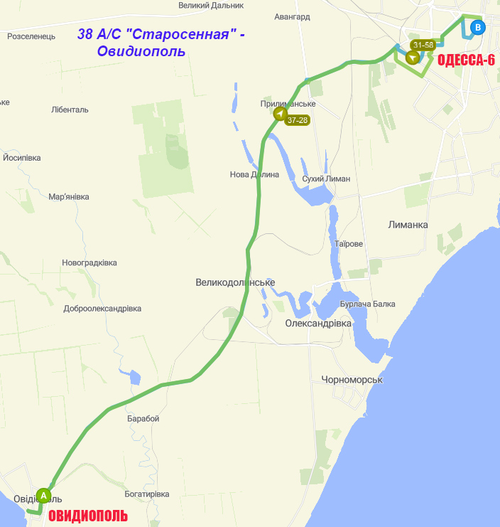 | 38 | Одесса-6 (111653) - Мечникова (9289) - Заньковецкой (ст. Товарная) (55866) - Селекционный институт (8639) - Промрынок 7-й км. (111431) - Прилиманское (111286) - Новая Долина (111284) - Большая Долина (111816) - Барабой (112343) - Овидиополь (Кольцо) (112372) - Овидиополь (Рынок) (112346) - А/С "Овидиополь-2" (112347) | |