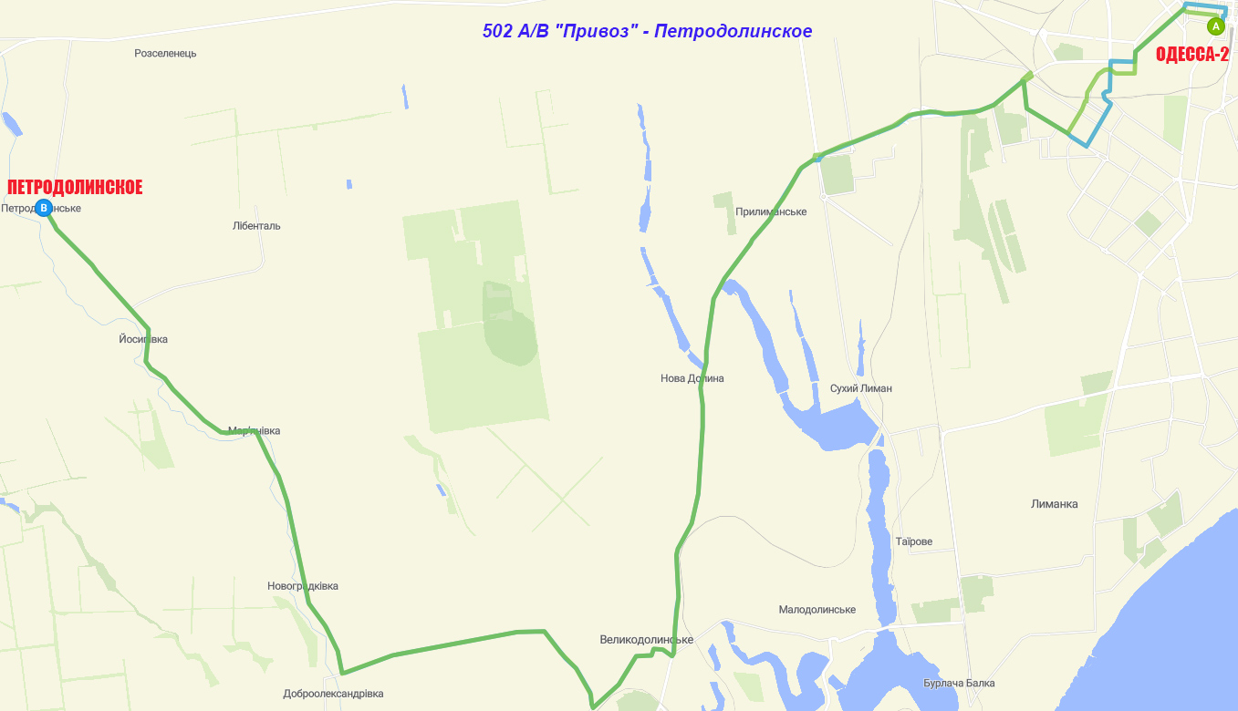 | 502 | Одесса-2 (111270) - Заньковецкой (ст. Товарная) (55866) - Селекционный институт (8639) - Промрынок 7-й км. (111431) - Прилиманское (111286) - Новая Долина (111284) - Большая Долина (111816) - Новоградовка (112363) - Марьяновка (112365) - Иосиповка (112367) - Либенталь - Петродолинское (112444) | |