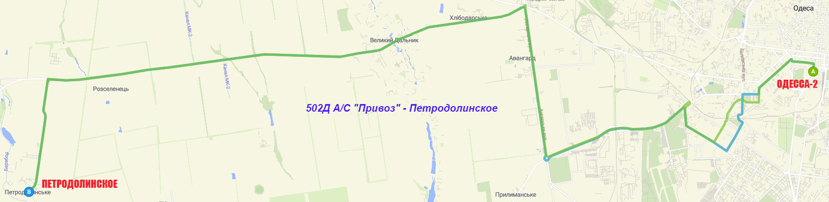 | 502Д | Одесса-2 (111645) - Заньковецкой (ст. Товарная) (55866) - Селекционный институт (8639) - Промрынок 7-й км. (111431) - Авангард (111008) - Два столба (111782) - Хлебодарское (111784) - Дальник (Церковь) (111785) - Дальник (Безверхова) (111786) - Дальник (Аптека) (111787) - Дальник (Рынок) (111788) - Расселенец (111844) - Петродолинское (112444) | |
