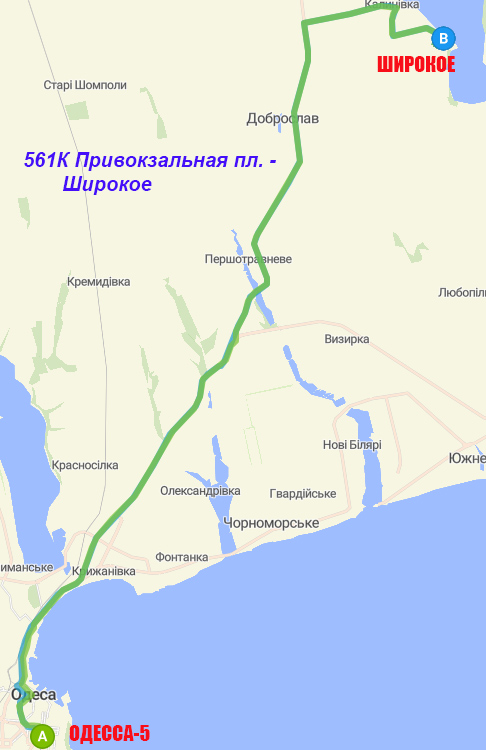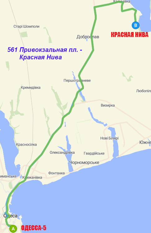 | 561 | Одесса-5 (112478) - Новый Рынок (4945) - Пересыпский мост (11489) - Ярмарочная пл. (14502) - Паустовского (111308) - Таврия-В "Суворовский" (108310) - ТЦ "Новая Линия" (111310) - Курган Славы (111322) - Свердлово (112004) - Ольшанка (112009) - Первомайское (112419) - Коминтерновское (112014) - Зориново (112117) - Калиновка (112195) - Широкое (112193) - Красная Нива (112190) | |
