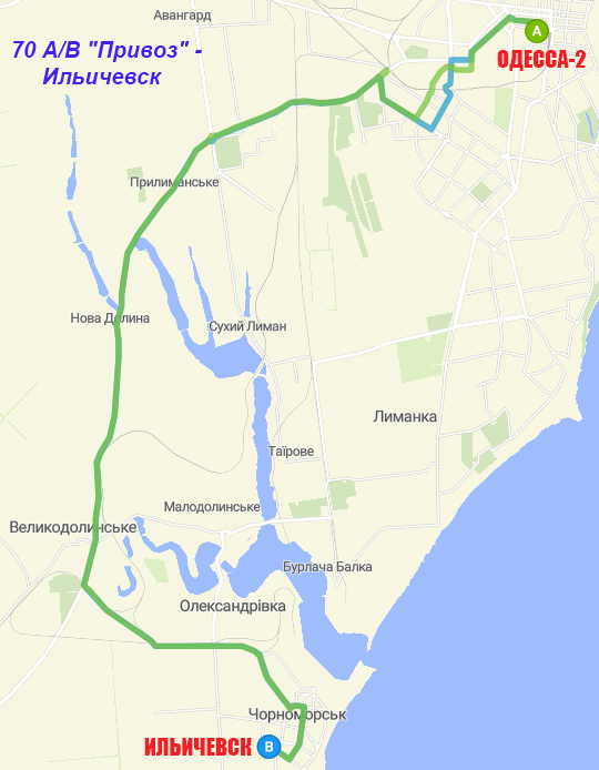 | 70 | Одесса-2 (111270) - Заньковецкой (ст. Товарная) (55866) - Селекционный институт (8639) - Промрынок 7-й км. (111431) - Прилиманское (111286) - Новая Долина (111284) - Большая Долина (111282) - - Переезд (111827) - Победы (111274) - Горсовет (111479) - Просп. Мира (111481) - А/С "Ильичевск" (111271) | |