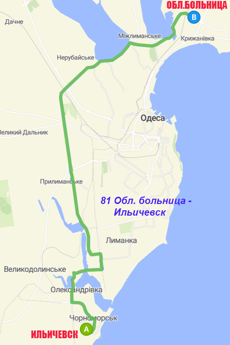 | 81 | Областная больница (111268) - Пос. Шевченко (11721) - Санаторий "Куяльник" (11716) - Авторынок (11714) - Котовка (11713) - Усатово (11709) - Нерубайское (11707) - Западное кладбище (111083) - Два столба (11700) - Авангард (111009) - Сухой Лиман (111505) - Таирово (111493) - Бурлачья Балка (111289) - Малодолинское (111293) - Александровка (111294) - Победы (111274) - Горсовет (111479) - Просп. Мира (111481) - А/С "Ильичевск" (111271) | |