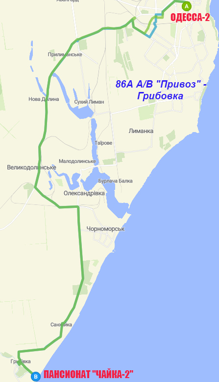 | 86А | Одесса-6 (111661) - Заньковецкой (ст. Товарная) (55866) - Селекционный институт (8639) - Промрынок 7-й км. (111431) - Прилиманское (111286) - Новая Долина (111284) - Большая Долина (111282) - - Молодежное (111490) - Дюково (111665) - с/к "Ветеран" (111669) - с/к "Приморский" (111671) - Санжейка (111676) - Грибовка (111685) - Грибовка ("Чайка-2") (111686) | |