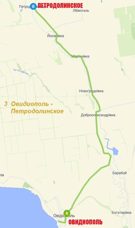 | 3 | Овидиополь - Овидиополь (кольцо) (112372) - Доброалександровка (112361) - Новоградовка (112363) - Марьяновка (112365) - Иосиповка (112367) - Петродолинское (112444) | |