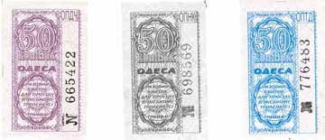 Билеты Анонимного общества Одесских трамваев стоимостью 1 руб., 1919 г. Служили также средством выплаты зарплаты.