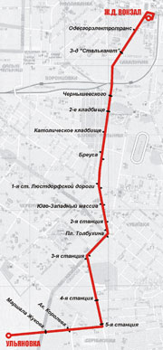 | Зима - Александровский участок - Судебный пер. - ж.д. вокзал (залы 3-го класса) - Старосенная пл. - Водопроводная - Большефонтанская дорога - Приют Шувалова