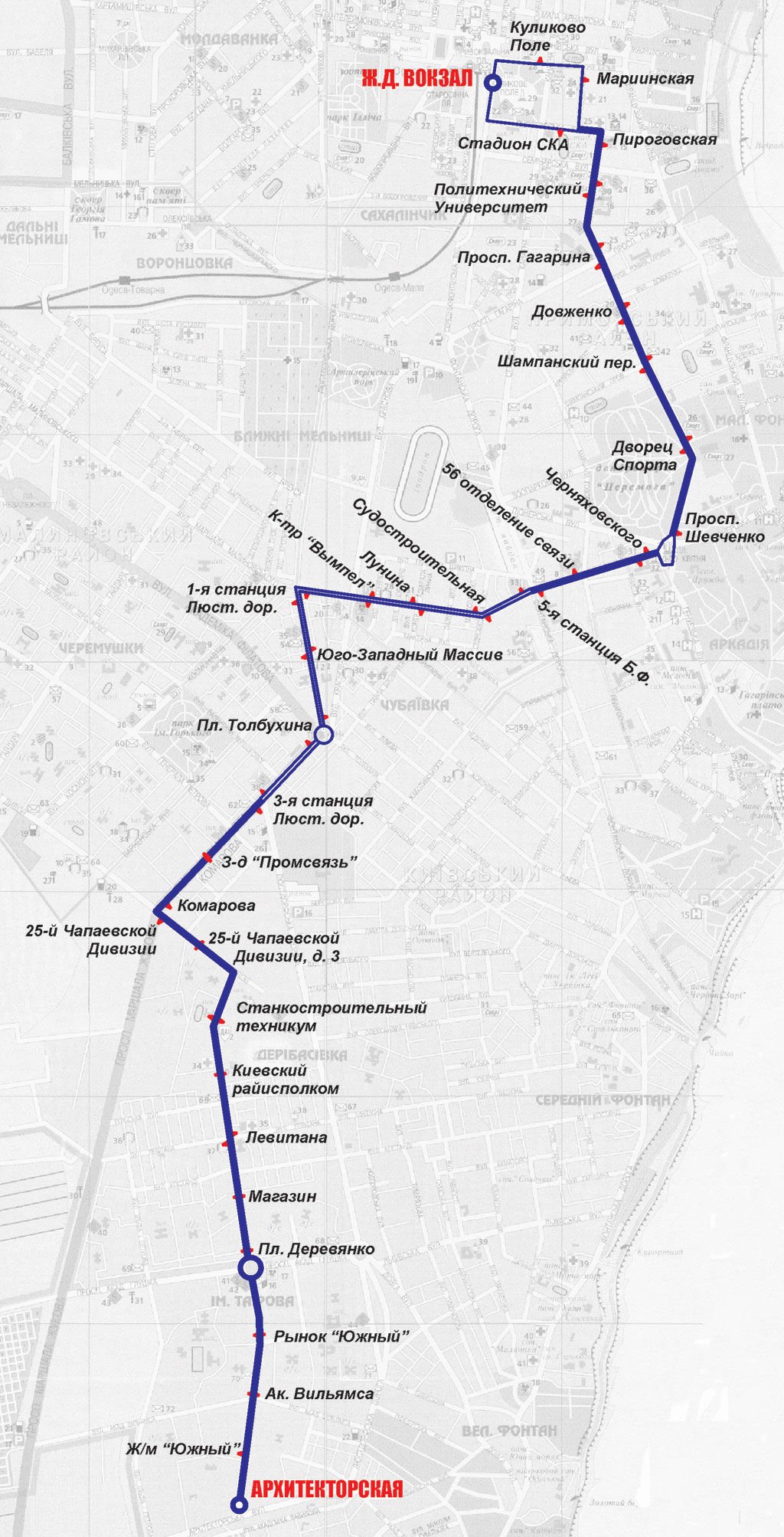 | Пл. Толстого - Льва Толстого - Бунина - Ришельевская (обратно Пушкинская - Греческая - Ришельевская) - Привокзальная пл. - Среднефонтанская - Пироговская (обратно Мариинская - Итальянский б-р) - Пироговский пер. - Новоаркадийская - Пл. 10 Апреля - Черняховского - Адмиральский просп. - Люстдорфская дорога - Комарова - 25-й Чапаевской Дивизии - Ак. Королева - Архитекторская