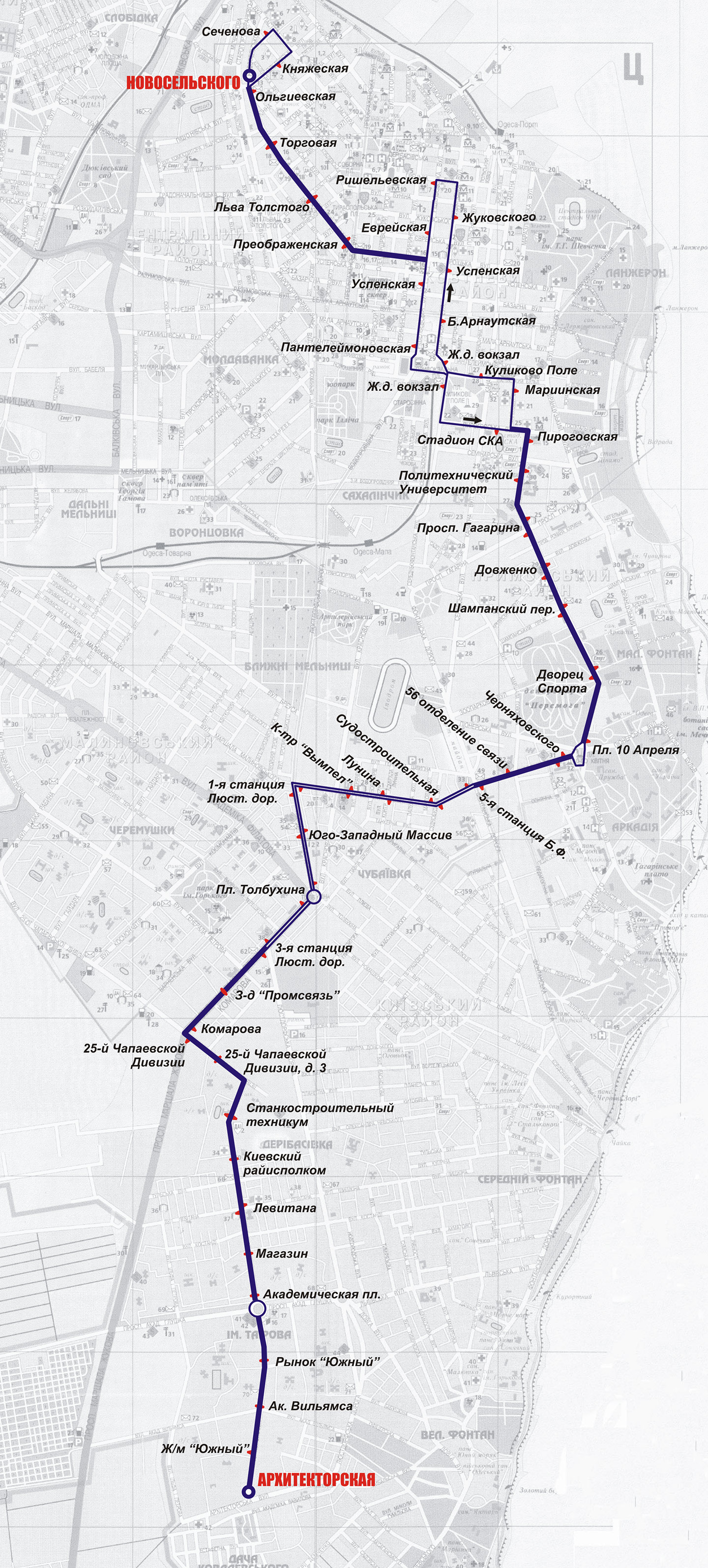 | Новосельского (обратно Ольгиевская - Пастера - Сеченова) - Троицкая - Ришельевская (обратно Пушкинская - Греческая - Ришельевская) - Привокзальная пл. - Среднефонтанская - Пироговская (обратно Мариинская - Итальянский б-р) - Пироговский пер. - Новоаркадийская - Пл. 10 Апреля - Черняховского - Адмиральский просп. - Люстдорфская дорога - Комарова - 25-й Чапаевской Дивизии - Ак. Королева - Архитекторская