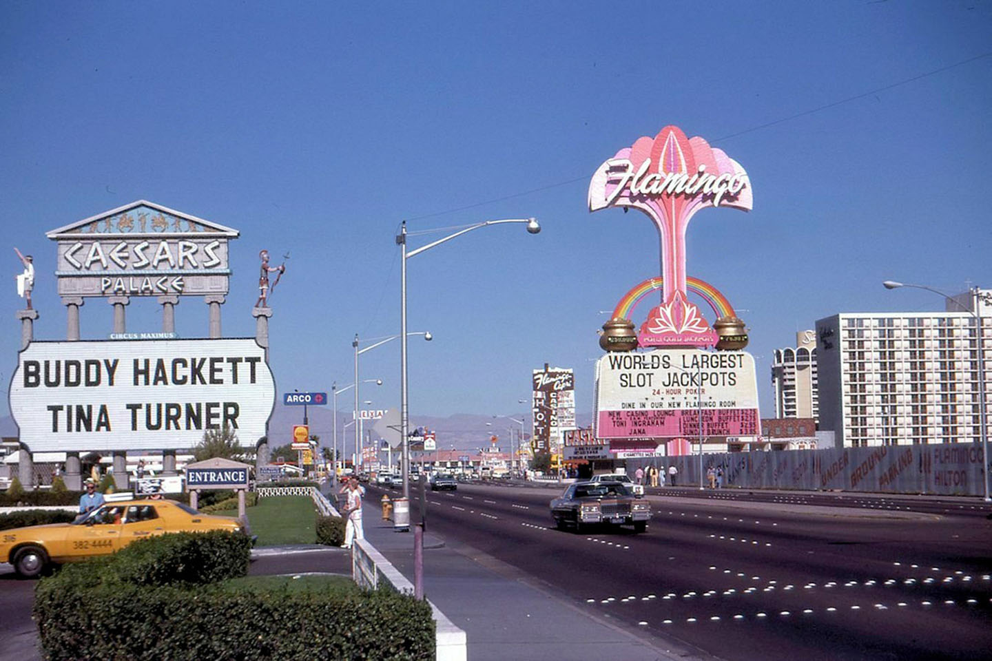 | Moving forward another 2 years and looking south. On a corner of Flamingo Road and Strip is now Barbary Coast Hotel, MGM (not MGM Grand, just plain MGM) is on the southeast corner, Alladin hotel is still standing. Photo 1979. |